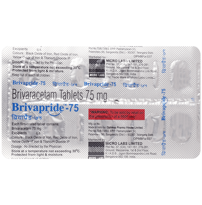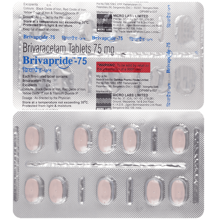 description:Brivapride 75mg Tablet is an anti-epileptic medicine used to treat seizures (fits) in epilepsy. It can be used alone or along with other medicines. It helps to prevent seizures for as long as you continue to take it. Brivapride 75mg Tablet suppresses the abnormal electrical activity in the brain. You can take it regularly with or without food but try to take it at the same time each day to get the most benefit. The dose and how often you need it will be decided by your doctor so that you get the right amount to control your seizures. It may be increased gradually.It is generally advised as a long-term treatment. You should continue taking it for as long as your doctor has told you to, even if you feel well. If you stop or miss doses your seizures could get worse. Do not stop taking this medicine unless your doctor tells you to. This is because stopping the medicine suddenly could make your seizures worse.Some common side effects of this medicine include dizziness, headache, nausea, and vomiting. You may also experience behavioral changes, aggressive behavior, irritation, agitation, etc. Side effects are more common during the first few weeks and usually lessen as your body gets used to the medicine. Most of these side effects do not need medical attention, but some of them can be serious. A small number of people being treated with this medicine have had thoughts of harming or killing themselves. Contact your doctor if your mood changes for the worse.Before taking it, you should tell your doctor if you have liver or kidney-related problems, depression, or suicidal thoughts, and if you are pregnant or planning to become pregnant. Breastfeeding mothers should also consult their doctor before taking this medicine.