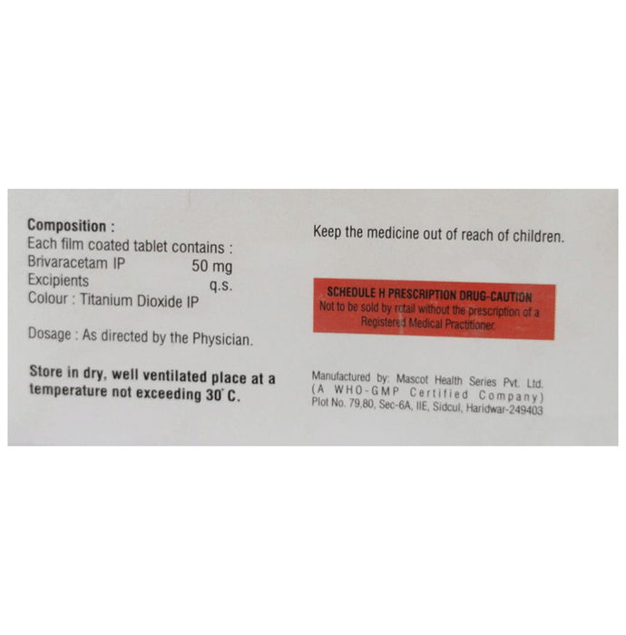 Marketer:Jagsam Pharma,Composition:Brivaracetam (50mg), medicine_typedrugs,Packaging Detail:strip of 10 tablets,          Package:Strip,Qty:10,Product Form:Tablet, prescription_required:Prescription Required,primary_use: