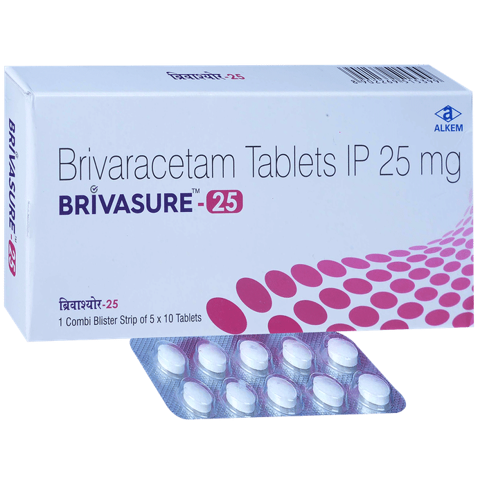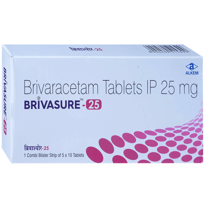 description:Brivasure 25mg Tablet is an anti-epileptic medicine used to treat seizures (fits) in epilepsy. It can be used alone or along with other medicines. It helps to prevent seizures for as long as you continue to take it. Brivasure 25mg Tablet suppresses the abnormal electrical activity in the brain. You can take it regularly with or without food but try to take it at the same time each day to get the most benefit. The dose and how often you need it will be decided by your doctor so that you get the right amount to control your seizures. It may be increased gradually.It is generally advised as a long-term treatment. You should continue taking it for as long as your doctor has told you to, even if you feel well. If you stop or miss doses your seizures could get worse. Do not stop taking this medicine unless your doctor tells you to. This is because stopping the medicine suddenly could make your seizures worse.Some common side effects of this medicine include dizziness, headache, nausea, and vomiting. You may also experience behavioral changes, aggressive behavior, irritation, agitation, etc. Side effects are more common during the first few weeks and usually lessen as your body gets used to the medicine. Most of these side effects do not need medical attention, but some of them can be serious. A small number of people being treated with this medicine have had thoughts of harming or killing themselves. Contact your doctor if your mood changes for the worse.Before taking it, you should tell your doctor if you have liver or kidney-related problems, depression, or suicidal thoughts, and if you are pregnant or planning to become pregnant. Breastfeeding mothers should also consult their doctor before taking this medicine.