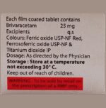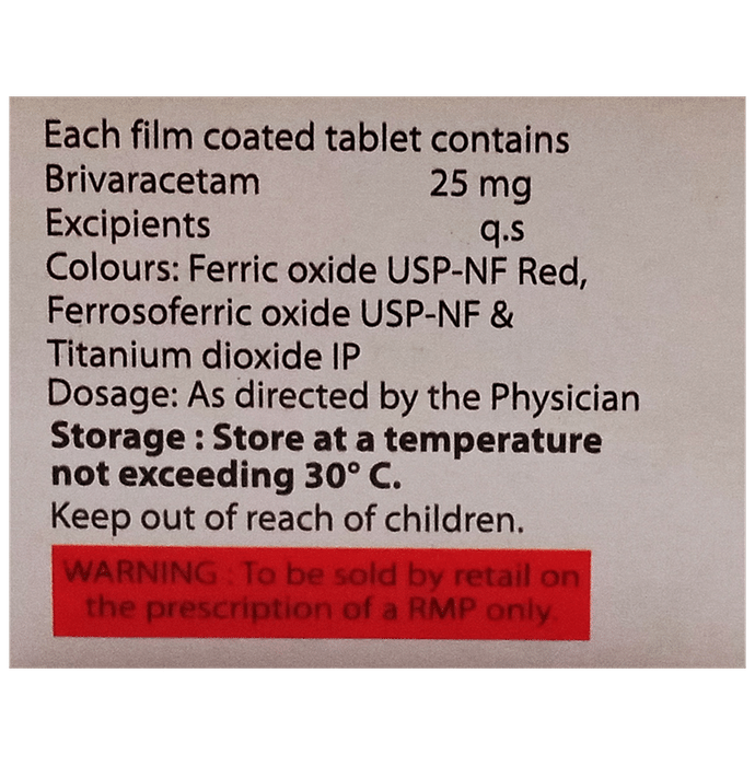 Marketer:Hetero Healthcare Limited,Composition:Brivaracetam (25mg), medicine_typedrugs,Packaging Detail:strip of 10 tablets,          Package:Strip,Qty:10,Product Form:Tablet, prescription_required:Prescription Required,primary_use: