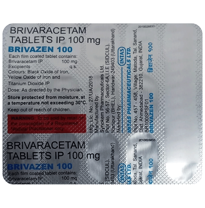 description:Brivazen 100 Tablet is an anti-epileptic medicine used to treat seizures (fits) in epilepsy. It can be used alone or along with other medicines. It helps to prevent seizures for as long as you continue to take it.Brivazen 100 Tablet suppresses the abnormal electrical activity in the brain. You can take it regularly with or without food but try to take it at the same time each day to get the most benefit. The dose and how often you need it will be decided by your doctor so that you get the right amount to control your seizures. It may be increased gradually.It is generally advised as a long-term treatment. You should continue taking it for as long as your doctor has told you to, even if you feel well. If you stop or miss doses your seizures could get worse. Do not stop taking this medicine unless your doctor tells you to. This is because stopping the medicine suddenly could make your seizures worse.Some common side effects of this medicine include dizziness, headache, nausea, and vomiting. You may also experience behavioral changes, aggressive behavior, irritation, agitation, etc. Side effects are more common during the first few weeks and usually lessen as your body gets used to the medicine. Most of these side effects do not need medical attention, but some of them can be serious. A small number of people being treated with this medicine have had thoughts of harming or killing themselves. Contact your doctor if your mood changes for the worse.Before taking it, you should tell your doctor if you have liver or kidney-related problems, depression, or suicidal thoughts, and if you are pregnant or planning to become pregnant. Breastfeeding mothers should also consult their doctor before taking this medicine.