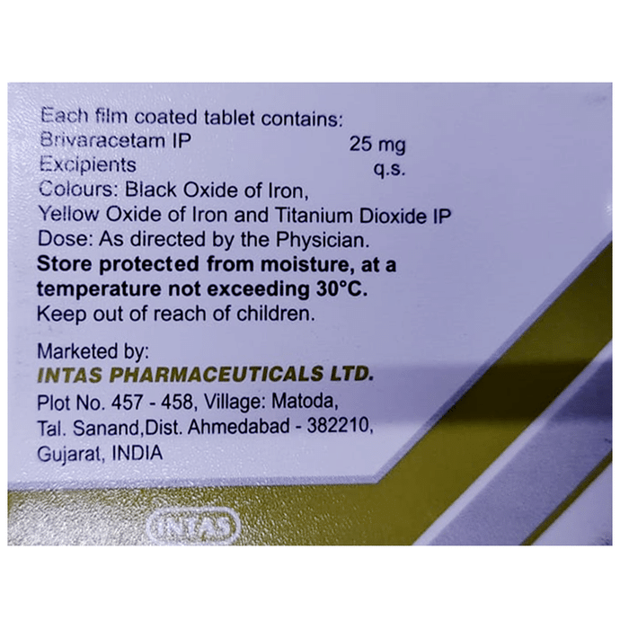Marketer:Intas Pharmaceuticals Ltd,Composition:Brivaracetam (25mg), medicine_typedrugs,Packaging Detail:strip of 15 tablets,          Package:Strip,Qty:15,Product Form:Tablet, prescription_required:Prescription Required,primary_use: