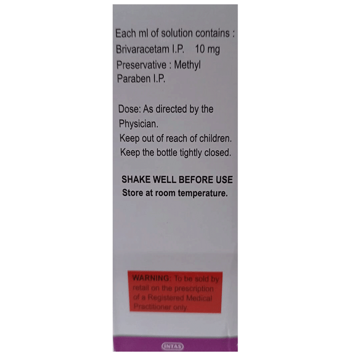 Marketer:Intas Pharmaceuticals Ltd,Composition:Brivaracetam (10mg/ml), medicine_typedrugs,Packaging Detail:bottle of 200 ml Oral Solution,          Package:Bottle,Qty:200 ml,Product Form:Oral Solution, prescription_required:Prescription Required,primary_use: