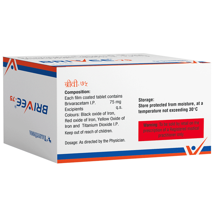 description:Brivee 75 Tablet is an anti-epileptic medicine used to treat seizures (fits) in epilepsy. It can be used alone or along with other medicines. It helps to prevent seizures for as long as you continue to take it. Brivee 75 Tablet suppresses the abnormal electrical activity in the brain. You can take it regularly with or without food but try to take it at the same time each day to get the most benefit. The dose and how often you need it will be decided by your doctor so that you get the right amount to control your seizures. It may be increased gradually.It is generally advised as a long-term treatment. You should continue taking it for as long as your doctor has told you to, even if you feel well. If you stop or miss doses your seizures could get worse. Do not stop taking this medicine unless your doctor tells you to. This is because stopping the medicine suddenly could make your seizures worse.Some common side effects of this medicine include dizziness, headache, nausea, and vomiting. You may also experience behavioral changes, aggressive behavior, irritation, agitation, etc. Side effects are more common during the first few weeks and usually lessen as your body gets used to the medicine. Most of these side effects do not need medical attention, but some of them can be serious. A small number of people being treated with this medicine have had thoughts of harming or killing themselves. Contact your doctor if your mood changes for the worse.Before taking it, you should tell your doctor if you have liver or kidney-related problems, depression, or suicidal thoughts, and if you are pregnant or planning to become pregnant. Breastfeeding mothers should also consult their doctor before taking this medicine.
