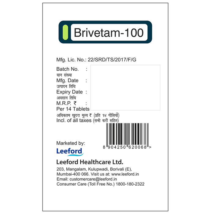 Marketer:Leeford Healthcare Ltd,Composition:Brivaracetam (100mg), medicine_typedrugs,Packaging Detail:strip of 14 tablets,          Package:Strip,Qty:14,Product Form:Tablet, prescription_required:Prescription Required,primary_use: