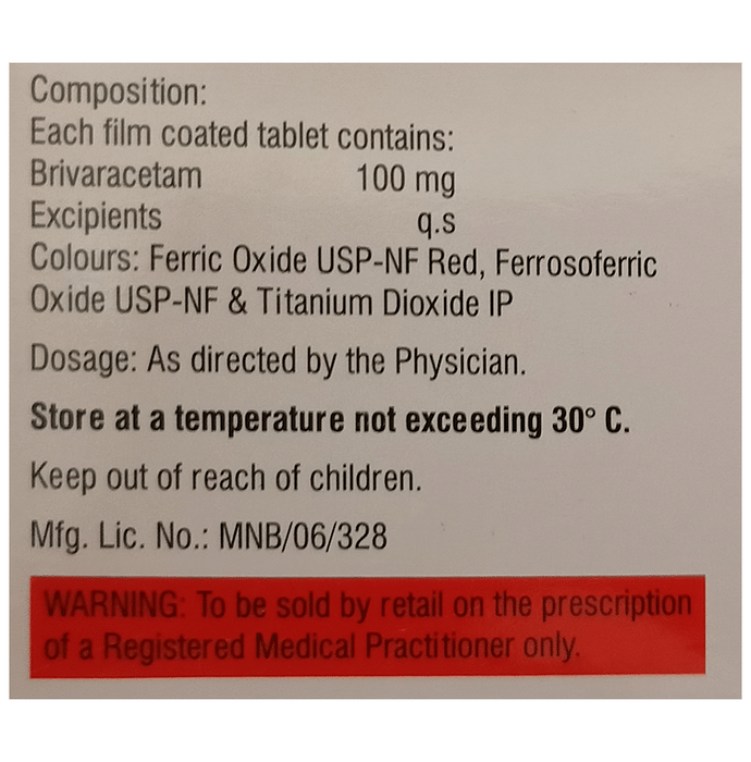 Marketer:Lupin Ltd,Composition:Brivaracetam (100mg), medicine_typedrugs,Packaging Detail:strip of 10 tablets,          Package:Strip,Qty:10,Product Form:Tablet, prescription_required:Prescription Required,primary_use: