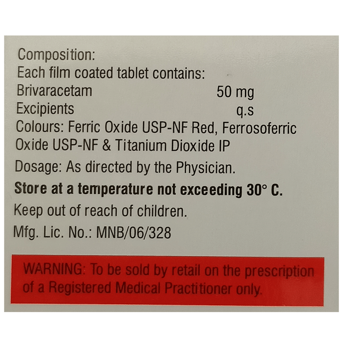 Marketer:Lupin Ltd,Composition:Brivaracetam (50mg), medicine_typedrugs,Packaging Detail:strip of 10 tablets,          Package:Strip,Qty:10,Product Form:Tablet, prescription_required:Prescription Required,primary_use: