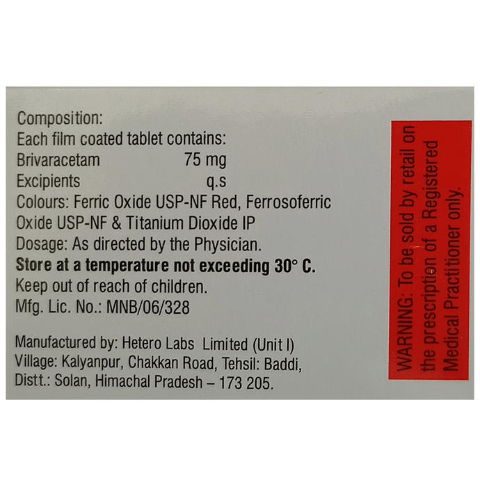 Marketer:Lupin Ltd,Composition:Brivaracetam (75mg), medicine_typedrugs,Packaging Detail:strip of 10 tablets,                   Package:Strip,Qty:10,Product Form:Tablet, prescription_required:Prescription Required,primary_use:
