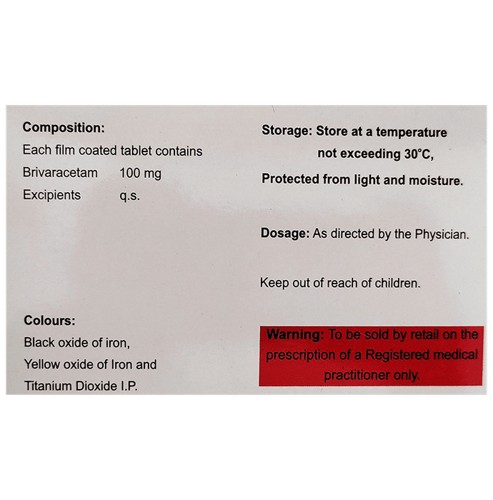 description:Brivissa 100 Tablet is an anti-epileptic medicine used to treat seizures (fits) in epilepsy. It can be used alone or along with other medicines. It helps to prevent seizures for as long as you continue to take it. Brivissa 100 Tablet suppresses the abnormal electrical activity in the brain. You can take it regularly with or without food but try to take it at the same time each day to get the most benefit. The dose and how often you need it will be decided by your doctor so that you get the right amount to control your seizures. It may be increased gradually.It is generally advised as a long-term treatment. You should continue taking it for as long as your doctor has told you to, even if you feel well. If you stop or miss doses your seizures could get worse. Do not stop taking this medicine unless your doctor tells you to. This is because stopping the medicine suddenly could make your seizures worse.Some common side effects of this medicine include dizziness, headache, nausea, and vomiting. You may also experience behavioral changes, aggressive behavior, irritation, agitation, etc. Side effects are more common during the first few weeks and usually lessen as your body gets used to the medicine. Most of these side effects do not need medical attention, but some of them can be serious. A small number of people being treated with this medicine have had thoughts of harming or killing themselves. Contact your doctor if your mood changes for the worse.Before taking it, you should tell your doctor if you have liver or kidney-related problems, depression, or suicidal thoughts, and if you are pregnant or planning to become pregnant. Breastfeeding mothers should also consult their doctor before taking this medicine.