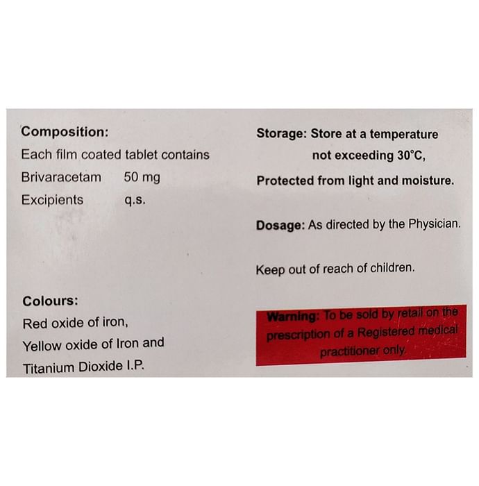 description:Brivissa 50 Tablet is an anti-epileptic medicine used to treat seizures (fits) in epilepsy. It can be used alone or along with other medicines. It helps to prevent seizures for as long as you continue to take it. Brivissa 50 Tablet suppresses the abnormal electrical activity in the brain. You can take it regularly with or without food but try to take it at the same time each day to get the most benefit. The dose and how often you need it will be decided by your doctor so that you get the right amount to control your seizures. It may be increased gradually.It is generally advised as a long-term treatment. You should continue taking it for as long as your doctor has told you to, even if you feel well. If you stop or miss doses your seizures could get worse. Do not stop taking this medicine unless your doctor tells you to. This is because stopping the medicine suddenly could make your seizures worse.Some common side effects of this medicine include dizziness, headache, nausea, and vomiting. You may also experience behavioral changes, aggressive behavior, irritation, agitation, etc. Side effects are more common during the first few weeks and usually lessen as your body gets used to the medicine. Most of these side effects do not need medical attention, but some of them can be serious. A small number of people being treated with this medicine have had thoughts of harming or killing themselves. Contact your doctor if your mood changes for the worse.Before taking it, you should tell your doctor if you have liver or kidney-related problems, depression, or suicidal thoughts, and if you are pregnant or planning to become pregnant. Breastfeeding mothers should also consult their doctor before taking this medicine.
