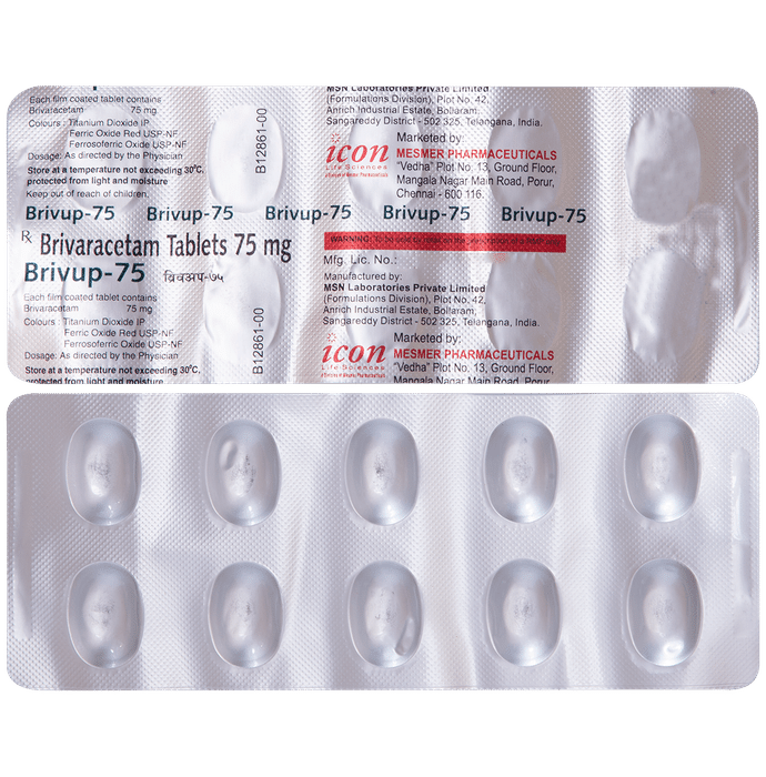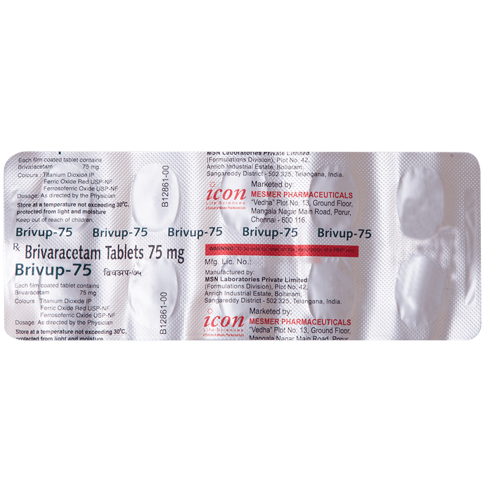 description:Brivup 75mg Tablet is an anti-epileptic medicine used to treat seizures (fits) in epilepsy. It can be used alone or along with other medicines. It helps to prevent seizures for as long as you continue to take it. Brivup 75mg Tablet suppresses the abnormal electrical activity in the brain. You can take it regularly with or without food but try to take it at the same time each day to get the most benefit. The dose and how often you need it will be decided by your doctor so that you get the right amount to control your seizures. It may be increased gradually.It is generally advised as a long-term treatment. You should continue taking it for as long as your doctor has told you to, even if you feel well. If you stop or miss doses your seizures could get worse. Do not stop taking this medicine unless your doctor tells you to. This is because stopping the medicine suddenly could make your seizures worse.Some common side effects of this medicine include dizziness, headache, nausea, and vomiting. You may also experience behavioral changes, aggressive behavior, irritation, agitation, etc. Side effects are more common during the first few weeks and usually lessen as your body gets used to the medicine. Most of these side effects do not need medical attention, but some of them can be serious. A small number of people being treated with this medicine have had thoughts of harming or killing themselves. Contact your doctor if your mood changes for the worse.Before taking it, you should tell your doctor if you have liver or kidney-related problems, depression, or suicidal thoughts, and if you are pregnant or planning to become pregnant. Breastfeeding mothers should also consult their doctor before taking this medicine.