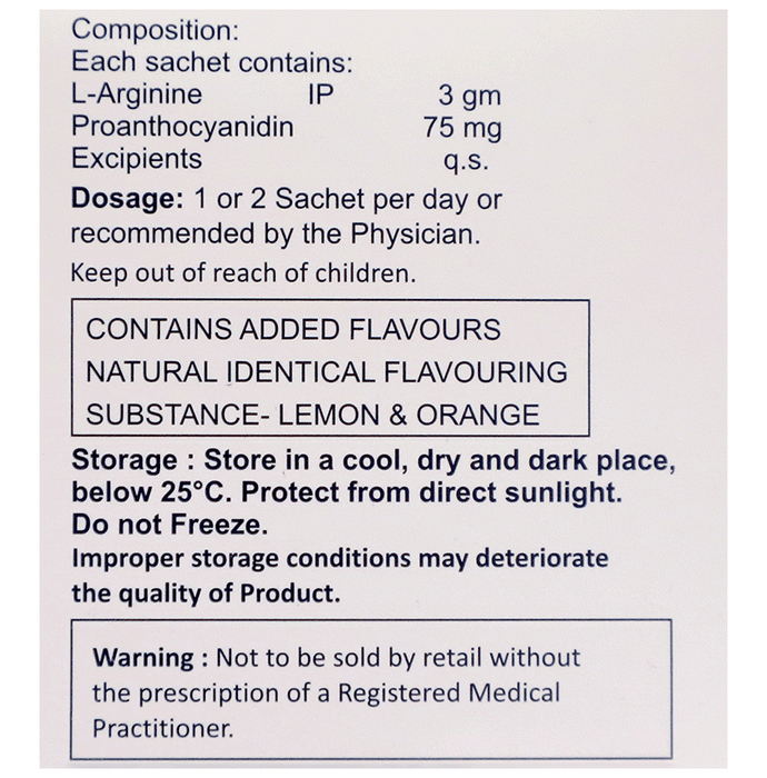 Marketer:Biovatic Lifescience,Composition:L-Arginine (3gm) + Proanthocyanidin (75mg), medicine_typedrugs,Packaging Detail:sachet of 5 gm Powder,          Package:Sachet,Qty:5 gm,Product Form:Powder, prescription_required:Prescription Required,primary_use: