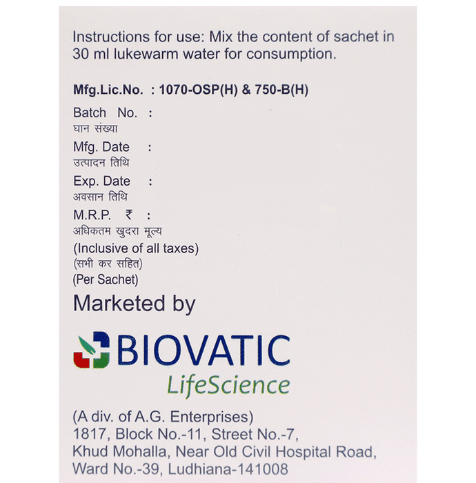 Manufacturer details:,                                   Marketer details:Biovatic Lifescience | 1817, STREET NO.7, KHUDH MOHALLA, OPP.CMC HOSPITAL, LUDHIANA, PUNJAB-141002 , INDIA,