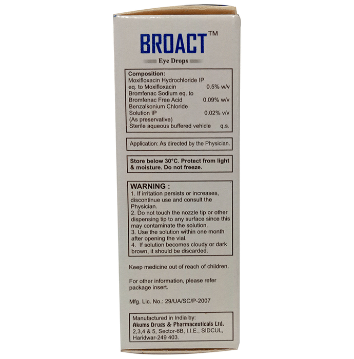 description:Broact Eye Drop is a prescription medicine used in the treatment of bacterial eye infections. It helps in relieving pain, itching, discomfort, pain, and irritation caused by the infection. It is also used to relieve postoperative pain, swelling, and redness. Broact Eye Drop is to be used only in the affected eye in the dose and duration as advised by the doctor. Wash your hands before using this medicine. It is advised to check the label for directions before use. Do not skip any doses and finish the full course of treatment even if you feel better. Stopping the medicine too early may lead to the infection returning or worsening.Use of this medicine may cause eye irritation, eye discomfort, and burning sensation at the application site. These are usually temporary and resolve with time. However, if they persist or get worse, inform your doctor. In case of accidental contact with your ears, nose, or mouth, immediately rinse it with water.Inform your doctor if you have a known allergy to any of the ingredients in this medicine or if you are taking any other medication. It is advised not to drive or operate heavy machinery immediately after using this medicine as it may cause temporary blurring of vision and may affect your ability to drive.