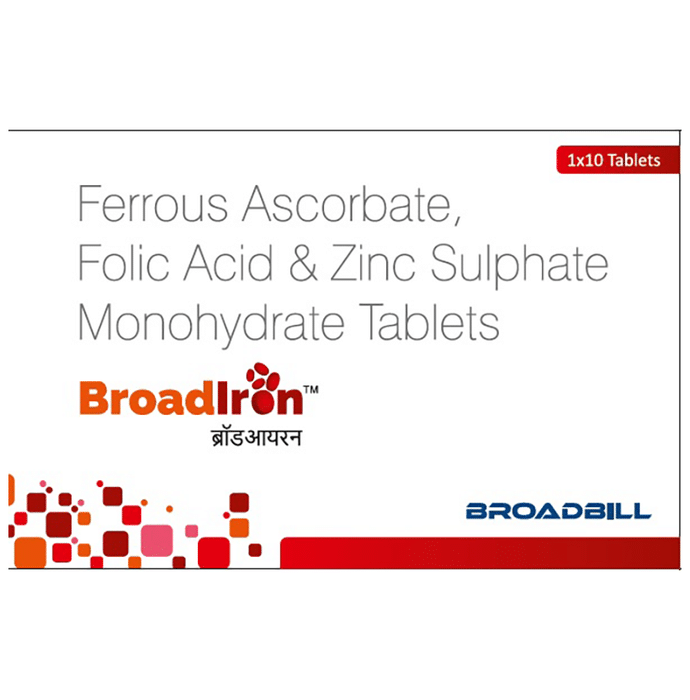 description:BroadIron Tablet has a combination of medicines which is used in the treatment of iron deficiency. It works by replenishing the iron stores in your body and corrects iron deficiency (anemia) by enhancing the absorption of iron in the body. It also helps in the formation of red blood cells. BroadIron Tablet can be taken with or without food. Intake of dairy products with this medicine should be avoided. It should be used in the dose and duration as prescribed by your doctor. This medicine should not be consumed more than the recommended dose.This is usually a safe medicine with very minimal side effects. Some of the most common side effects of this medicine may be dark-colored stools or stomach upset. Contact your doctor immediately if you notice any symptoms of allergic reactions like swelling, itching, difficulty in breathing, hives, etc.Before taking this medicine, tell your doctor if you have any other health conditions. Inform your doctor if you are taking any other medicines or if you are pregnant or breastfeeding. It is advised not to consume alcohol after taking this medicine.