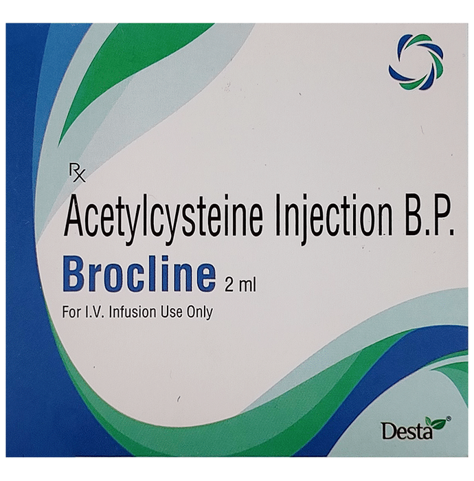 description:Brocline 2ml Injection is an antidote medication. It is used in the treatment of paracetamol overdose (when you may have taken too much paracetamol medicine). It protects your liver and helps to reduce the extent of the injury. Brocline 2ml Injection is given as an injection under the supervision of a doctor. It must be injected within 8 hours of paracetamol overdose. It can be given up to 24 hours, but medicine effective slow down when given after 24 hours of dosage overdose. Your doctor will decide how much you need to improve your symptoms. Always follow your doctor’s advice while taking this medicine.The most common side effects of this medicine include rash, urticaria, flushing, and itching. If these bother you or appear serious, let your doctor know. There may be ways of reducing or preventing them.Before taking this medicine let your doctor know if you suffer from asthma, as close monitoring is required while taking this medicine. Your doctor should also know about all other medicines you are taking as many of these may make this medicine less effective or change the way it works. Inform your doctor if you are pregnant, planning pregnancy, or breastfeeding.