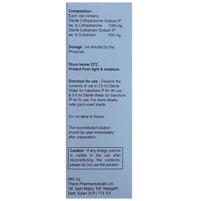 Marketer:Nurtureplus Biotech Private Limited,Composition:Cefoperazone (1000mg) + Sulbactam (500mg), medicine_typedrugs,Packaging Detail:vial of 1 Injection,          Package:Vial,Qty:1,Product Form:Injection, prescription_required:Prescription Required,primary_use: