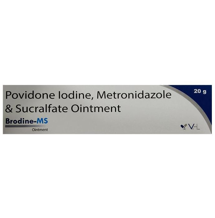description:Brodine-MS Ointment is a combination medicine used in the treatment of bacterial skin infections. It works by killing the microorganisms that cause infection. Brodine-MS Ointment may be used in the dose and duration suggested by the doctor. Applying it at the same time every day will help you remember to use it. The affected area should be clean and dry before application of the medicine. You must wash your hands thoroughly before and after applying this medicine. Do not stop using it until you have finished the complete course, even when you feel better.The most common side effects of this medicine include application site reactions like burning, irritation, itching, and redness. These are usually mild but let your doctor know if they bother you or last more than a few days. Avoid direct contact with eyes, nose, or mouth. If accidental exposure occurs, rinse immediately with plenty of water.It is not likely that other medicines you take by mouth or injection will affect the way this medicine works, but talk to your doctor before using it if you have recently used another medicine for the infection. The medicine is not recommended for pregnant women. Pregnant and breastfeeding mothers should consult their doctors before using this medicine.