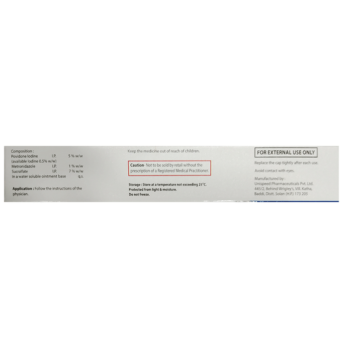 Marketer:Vhl Pharmaceuticals Private Limited,Composition:Metronidazole (1% w/w) + Sucralfate (7% w/w) + Povidone Iodine (5% w/w), medicine_typedrugs,Packaging Detail:tube of 20 gm Ointment,                   Package:Tube,Qty:20 gm,Product Form:Ointment, prescription_required:,primary_use: