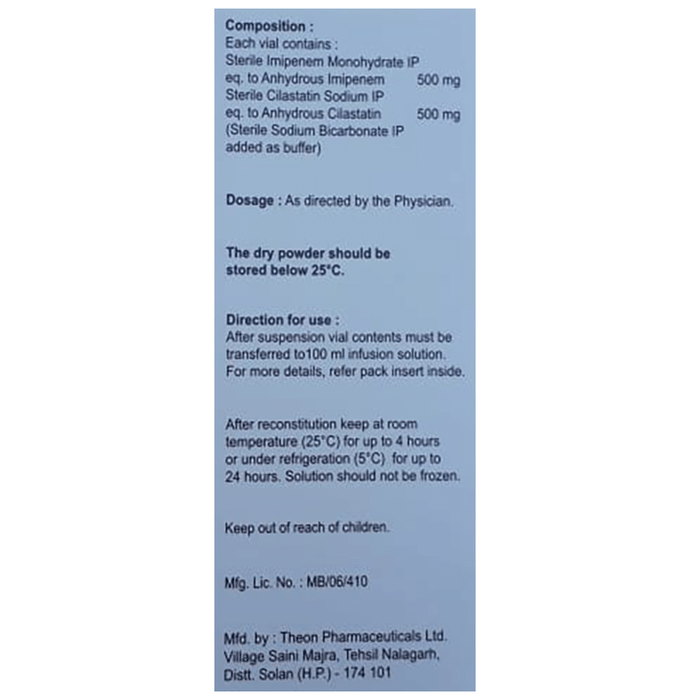 Marketer:Nurtureplus Biotech Private Limited,Composition:Imipenem (500mg) + Cilastatin (500mg), medicine_typedrugs,Packaging Detail:vial of 1 Injection,          Package:Vial,Qty:1,Product Form:Injection, prescription_required:Prescription Required,primary_use: