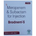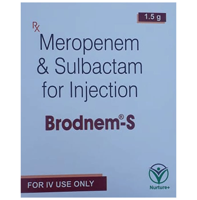 description:Brodnem-S Injection is a combination medicine that is prescribed to treat various types of bacterial infections. It fights against the microorganisms to prevent their growth. Brodnem-S Injection should only be administered under the supervision of a healthcare professional. Do not miss any scheduled appointments for taking this medicine. The course of the medicine should be completed even if you feel better.The common side effects of this medicine are nausea, vomiting, diarrhea, rashes, etc. You may also experience injection site redness, swelling, and pain that goes away with time. If any of the side effects get aggravated, you must consult your doctor immediately. If you experience any allergic reaction (rashes, itching, swelling, shortness of breath, etc.), you must seek immediate medical help.Before taking this medicine, you should tell your doctor if you are taking any medicines for any health condition. Pregnant or breastfeeding women should also consult with their doctor before taking it. Avoid drinking alcohol as it can cause excessive drowsiness with this medicine. It usually does not impair your ability to drive, but you should not drive if it makes you feel sleepy or dizzy.