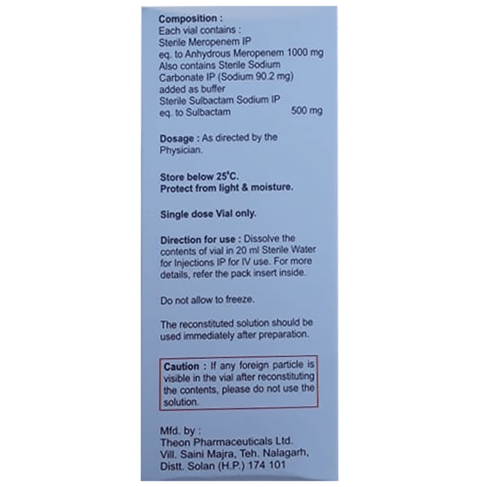 Marketer:Nurtureplus Biotech Private Limited,Composition:Meropenem (1000mg) + Sulbactam (500mg), medicine_typedrugs,Packaging Detail:vial of 1 Injection,                   Package:Vial,Qty:1,Product Form:Injection, prescription_required:Prescription Required,primary_use: