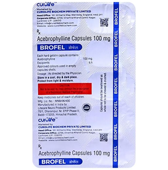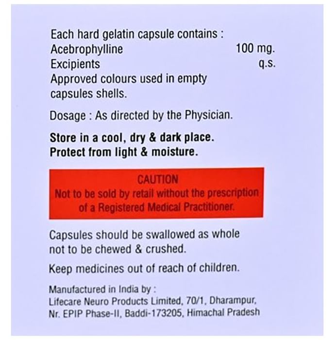 Marketer:Curolife Biochem Private Limited,Composition:Acebrophylline (100mg), medicine_typedrugs,Packaging Detail:strip of 10 capsules,          Package:Strip,Qty:10,Product Form:Capsule, prescription_required:Prescription Required,primary_use:
