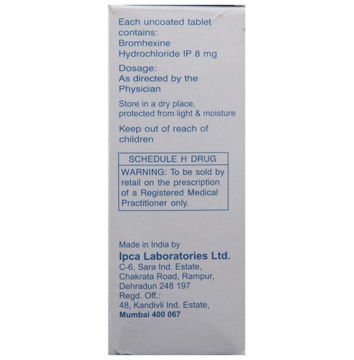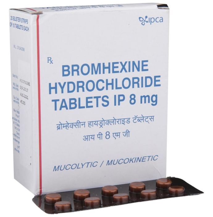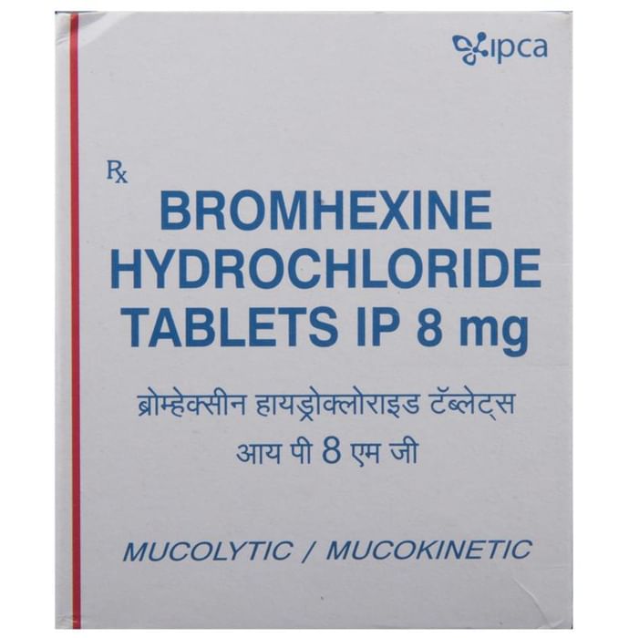 Bromhexine Hydrochloride 8mg Tablet is mucolytic medication. It is used in the treatment of various respiratory tract disorders associated with excessive mucus. It thins and loosens the mucus in the airway and makes it easier to cough out. Bromhexine Hydrochloride 8mg Tablet should be taken with food. For better results, it is suggested to take it at the same time every day. The dose and how often you take it depends on what you are taking it for. Your doctor will decide how much you need to improve your symptoms. It is advised not to use it for more than 14 days without doctor’s consultation.The most common side effects of this medicine include irritation of the ear, allergic skin rash, dizziness, and headache. Talk to your doctor if you’re worried about side effects or they do not go away. Generally, it is advised not to take alcohol while on treatment.Before taking this medicine, tell your doctor if you have liver or kidney disease or if you have stomach problems. Your doctor should also know about all other medicines you are taking as many of these may make this medicine less effective or change the way it works. You must take the doctor’s advice before using this medicine if you are pregnant or breastfeeding.