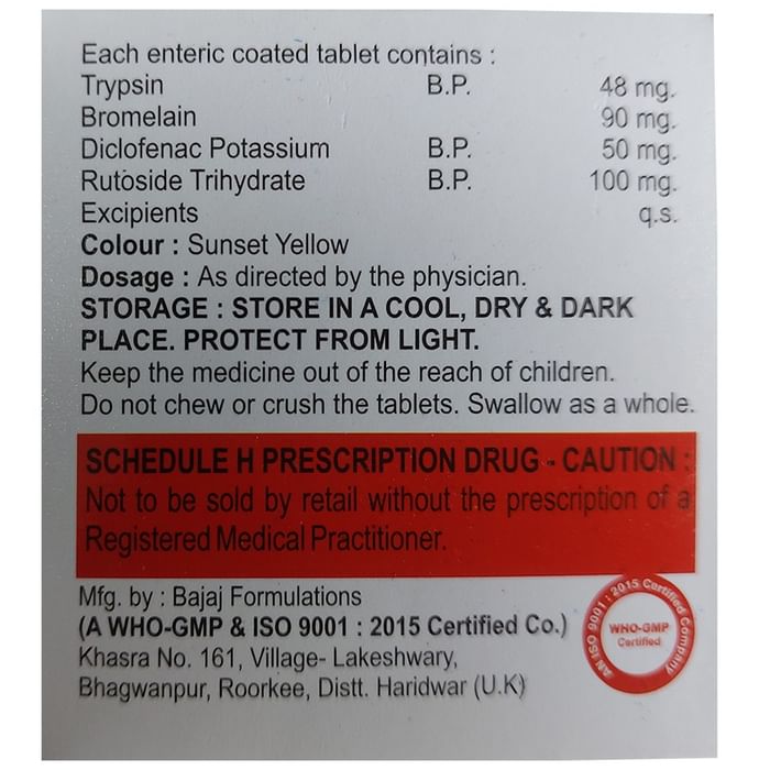 In Pain relief Bromin-D Tablet relieves pain, reduce swelling and ease inflammation in conditions like rheumatoid arthritis, osteoarthritis and ankylosing spondolytis. It also gives relief from muscle and back pain, toothache, or pain in the ear and throat. It works by reducing substances in the body that causes pain and swelling. Take it as prescribed to get the most benefit. This will help you to go about your daily activities more easily and have a better, more active, quality of life.