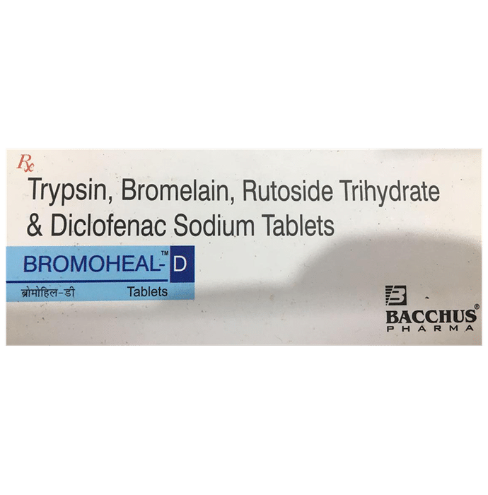 description:Bromoheal-D Tablet is a pain relieving medicine. It is used to reduce pain and inflammation in conditions like rheumatoid arthritis, ankylosing spondylitis, and osteoarthritis. It may also be used to relieve fever, muscle pain, back pain, toothache, or pain in the ear and throat. Bromoheal-D Tablet should be taken with food. This will prevent you from getting an upset stomach. You should take it regularly as advised by your doctor. Do not take more or use it for a longer duration than recommended by your doctor.Some of the common side effects of this medicine include nausea, vomiting, heartburn, diarrhea, loss of appetite, and indigestion. If any of these side effects bother you or do not go away with time, you should let your doctor know. Your doctor may help you with ways to reduce or prevent the side effects.The medicine may not be suitable for everybody. Before taking it, let your doctor know if you have any problems with your heart, kidneys, liver, or have stomach ulcers. To make sure it is safe for you, let your doctor know about all the other medicines you are taking. Pregnant and breastfeeding mothers should first consult their doctors before using this medicine.