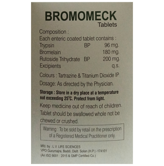 description:Bromomeck Tablet is a pain-relieving medicine. It is used in the treatment of various conditions such as fever, headache, arthritis-related pain, menstrual cramps, and toothache. Bromomeck Tablet should be taken with or without food. The dose and duration will depend on what you are using it for and how well it helps your symptoms. Use it regularly and do not discontinue using it until the doctor tells you it is alright to stop.The medicine is generally safe with little or no side effects. However, if you experience any symptoms which you believe are caused by the use of this medicine, let your doctor know. Your doctor may be able to suggest ways of preventing or reducing the side effects. In general, you should try to use the smallest amount necessary to control your symptoms.Before using the medicine, you should tell your doctor if you have any other medical conditions or disorders. To make sure it is safe for you, you should also tell your doctor all the other medicines you are taking. Before using the medicine, let your doctor also know if you have any problems with your liver or kidneys. Pregnant and breastfeeding women should consult their doctors first before using the medicine.