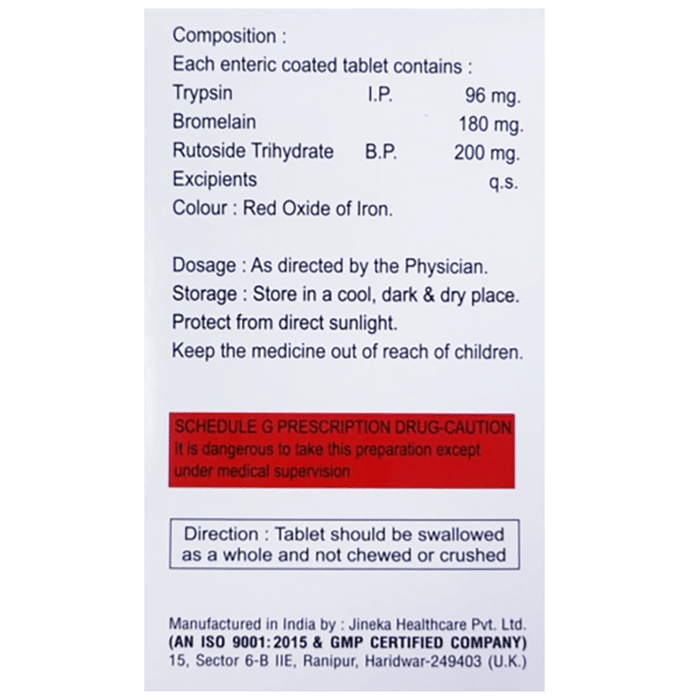 Marketer:Unimac Pharmaceuticals Pvt Ltd,Composition:Bromelain (180mg) + Trypsin (96mg) + Rutoside (200mg), medicine_typedrugs,Packaging Detail:strip of 10 tablets,          Package:Strip,Qty:10,Product Form:Tablet, prescription_required:Prescription Required,primary_use: