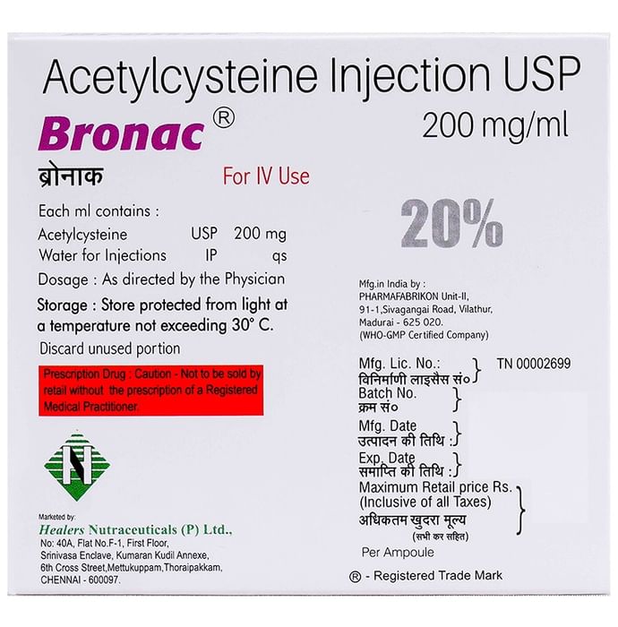 description:Bronac Injection is an antidote medication. It is used in the treatment of paracetamol overdose (when you may have taken too much paracetamol medicine). It protects your liver and helps to reduce the extent of the injury. Bronac Injection is given as an injection under the supervision of a doctor. It must be injected within 8 hours of paracetamol overdose. It can be given up to 24 hours, but medicine effective slow down when given after 24 hours of dosage overdose. Your doctor will decide how much you need to improve your symptoms. Always follow your doctor’s advice while taking this medicine.The most common side effects of this medicine include rash, urticaria, flushing, and itching. If these bother you or appear serious, let your doctor know. There may be ways of reducing or preventing them.Before taking this medicine let your doctor know if you suffer from asthma, as close monitoring is required while taking this medicine. Your doctor should also know about all other medicines you are taking as many of these may make this medicine less effective or change the way it works. Inform your doctor if you are pregnant, planning pregnancy, or breastfeeding.