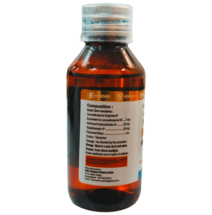 Marketer:Hindavi Pharmaceutical Pvt Ltd,Composition:Levosalbutamol (1mg/5ml) + Ambroxol (30mg/5ml) + Guaifenesin (50mg/5ml), medicine_typedrugs,Packaging Detail:bottle of 100 ml Expectorant,          Package:Bottle,Qty:100 ml,Product Form:Expectorant, prescription_required:Prescription Required,primary_use: