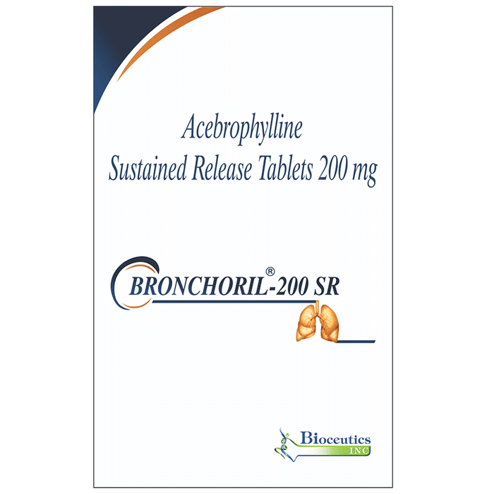 description:Bronchoril 200 SR Tablet is used to treat and prevent symptoms of asthma, bronchitis, and chronic obstructive pulmonary disorder (a lung disorder in which flow of air to the lung is blocked). It helps in relaxing the muscles of the air passages, thus widening it and making it easier to breathe. Bronchoril 200 SR Tablet can be taken with the food in evening. Take it at the same time every day to get the most benefit. The dose and how often you take it depends on what you are taking it for. Your doctor will decide how much you need to improve your symptoms. Take this medicine for as long as it is prescribed for you. Do not miss even a single dose, if in any case, you missed a dose, take it as soon as you remember or better to skip the missed dose and continue with regular dosing. It does not work immediately or prevent the already started breathing trouble, hence always carry your medical inhaler with you for an emergency.The most common side effects of this medicine include abdominal discomfort, abdominal distension, vomiting, abdominal pain, diarrhea, constipation, and heart burn. If these bother you or appear serious, let your doctor know. There may be ways of reducing or preventing them. Generally, it is advised not to consume alcohol or do not smoke while on treatment.Before taking this medicine, let your doctor if you have kidney or liver disease or if you have heart-related problems. Your doctor should also know about all other medicines you are taking as many of these may make this medicine less effective or change the way it works. Inform your doctor if you are pregnant or breastfeeding before starting the treatment.