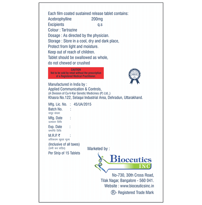 Marketer:Bioceutics Inc,Composition:Acebrophylline (200mg), medicine_typedrugs,Packaging Detail:strip of 10 tablet sr,          Package:Strip,Qty:10,Product Form:Tablet SR, prescription_required:Prescription Required,primary_use: