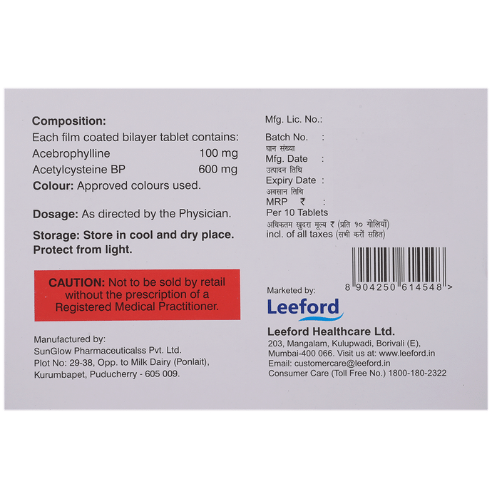 Marketer:Leeford Healthcare Ltd,Composition:Acebrophylline (100mg) + Acetylcysteine (600mg), medicine_typedrugs,Packaging Detail:strip of 10 tablets,                   Package:Strip,Qty:10,Product Form:Tablet, prescription_required:Prescription Required,primary_use:
