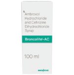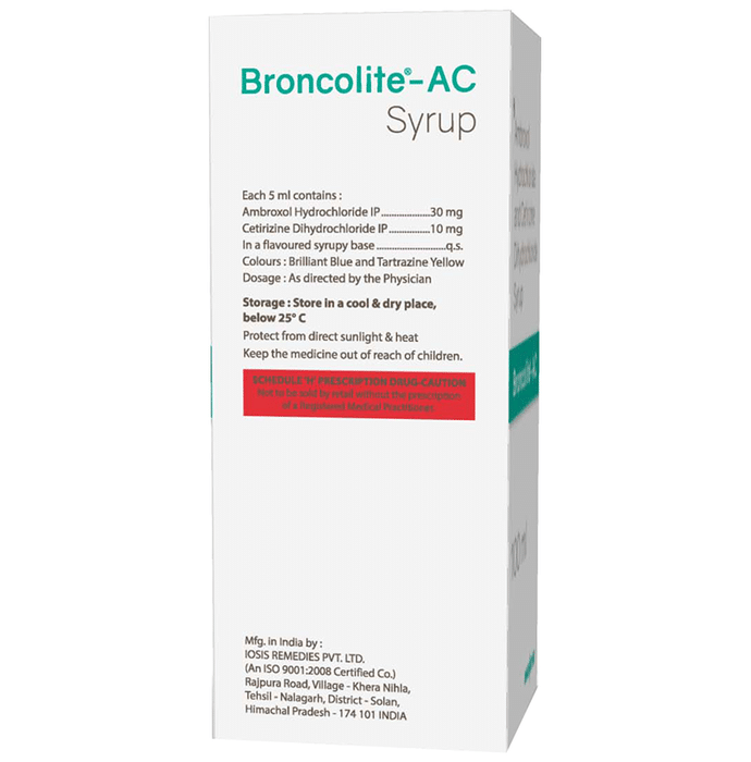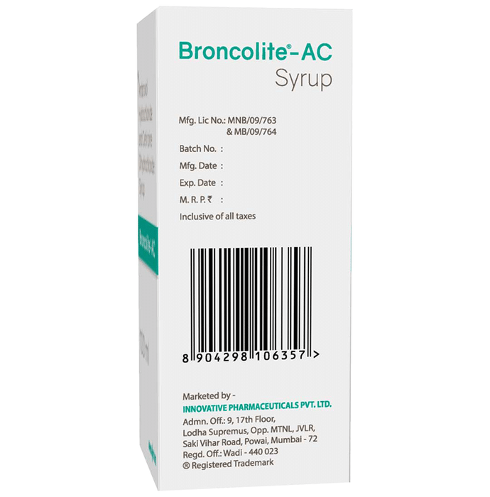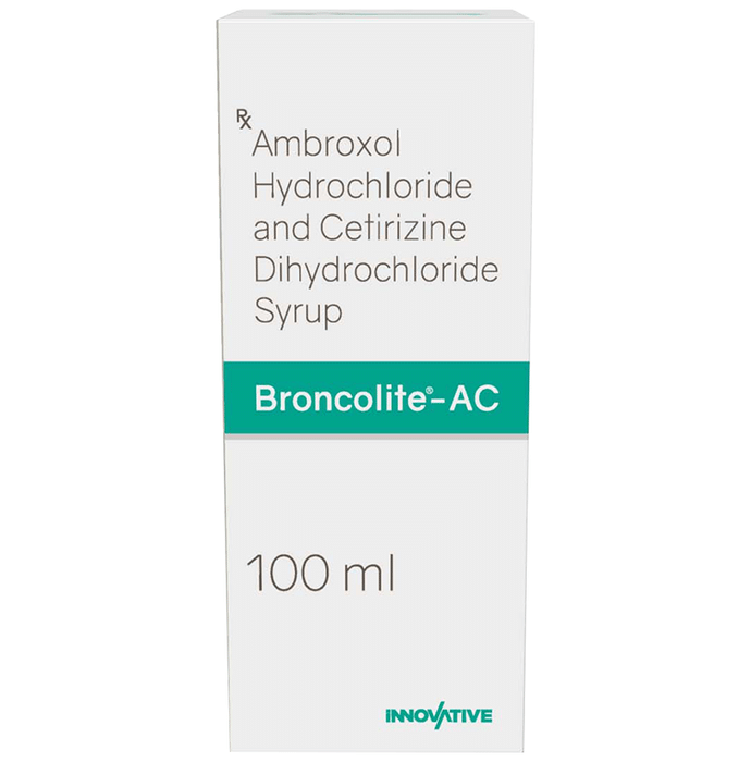 description:Broncolite-AC Syrup is a combination medicine used in the treatment of cough. It relieves allergic symptoms such as sneezing, running nose, watery eyes, itching, swelling, and congestion or stiffness. It also thins and loosens mucus, making it easier to cough out. Broncolite-AC Syrup is taken with or without food in a dose and duration as advised by the doctor. The dose you are given will depend on your condition and how you respond to the medicine. You should keep taking this medicine for as long as your doctor recommends. If you stop treatment too early your symptoms may come back and your condition may worsen. Let your doctor know about all other medications you are taking as some may affect, or be affected by this medicine.The most common side effects are stomach upset, dryness in mouth, fatigue, sedation, and allergic reaction. Most of these are temporary and usually resolve with time. Contact your doctor straight away if you are at all concerned about any of these side effects. This medicine can also cause dizziness and sleepiness, so do not drive or do anything that requires mental focus until you know how this medicine affects you. Avoid drinking alcohol while taking this medicine as it can make dizziness worse.Never support self-medication or recommend your medicine to another person. It is beneficial to have plenty of fluids while taking this medication. Before taking it, you should tell your doctor if you have any kidney and liver diseases. Pregnant or breastfeeding women should also consult their doctor before taking this medicine.