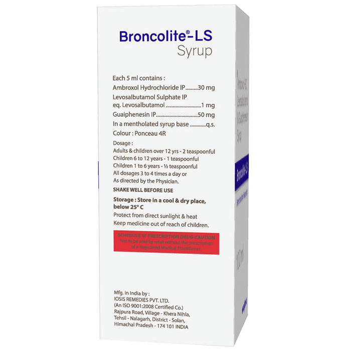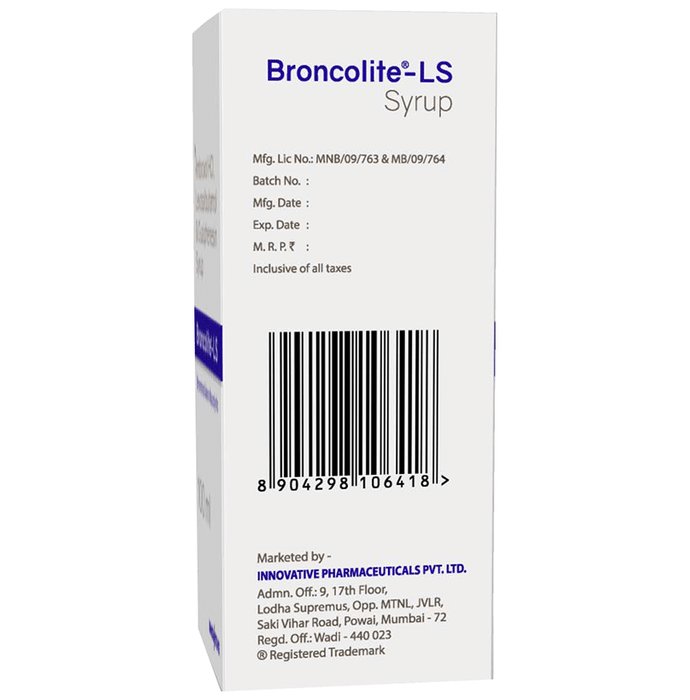 description:Broncolite-LS Syrup is a combination medicine used in the treatment of cough with mucus. It thins mucus in the nose, windpipe, and lungs, making it easier to cough out. It also provides relief from runny nose, sneezing, itching, and watery eyes. Broncolite-LS Syrup is taken with or without food in a dose and duration as advised by the doctor. The dose you are given will depend on your condition and how you respond to the medicine. You should keep taking this medicine for as long as your doctor recommends. If you stop treatment too early your symptoms may come back and your condition may worsen. Let your healthcare team know about all other medications you are taking as some may affect, or be affected by this medicine.The most common side effects are nausea, diarrhea, stomach pain, vomiting, muscle cramp, headache, skin rash, and increased heart rate. Most of these are temporary and usually resolve with time. Contact your doctor straight away if you are at all concerned about any of these side effects. This medicine can also cause sleepiness, so do not drive or do anything that requires mental focus until you know how this medicine affects you. Avoid drinking alcohol while taking this medicine as it can make sleepiness worse.Never support self-medication or recommend your medicine to another person. It is beneficial to have plenty of fluids while taking this medication. Before taking this medicine, you should tell your doctor if you are pregnant, planning pregnancy, or breastfeeding. You should also tell your doctor if you have any kidney or liver diseases so that your doctor can prescribe a suitable dose for you.