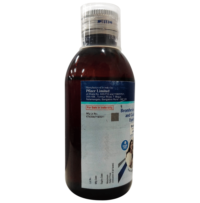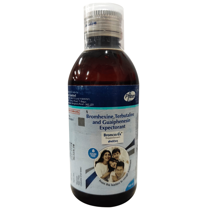 Marketer:Pfizer Ltd,Composition:Guaifenesin (50mg) + Terbutaline (1.25mg) + Bromhexine (4mg), medicine_typedrugs,Packaging Detail:bottle of 100 ml Syrup,          Package:Bottle,Qty:100 ml,Product Form:Syrup, prescription_required:Prescription Required,primary_use: