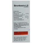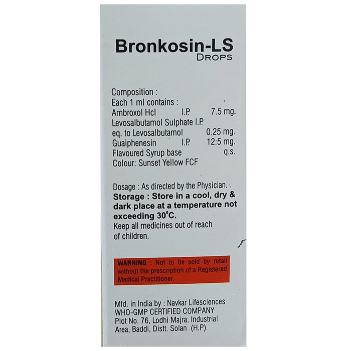description:Bronkosin-LS Oral Drops is used in the treatment of cough with mucus. It thins mucus in the nose, windpipe and lungs, making it easier to cough out. It also provides relief from runny nose, sneezing, itching, and watery eyes. Bronkosin-LS Oral Drops is taken with or without food in a dose and duration as advised by the doctor. The dose you are given will depend on your condition and how you respond to the medicine. You should keep taking this medicine for as long as your doctor recommends. If you stop treatment too early your symptoms may come back and your condition may worsen. Let your healthcare team know about all other medications you are taking as some may affect, or be affected by this medicine.The most common side effects are dizziness, vomiting, change in taste, diarrhea, headache, and rashes. Most of these are temporary and usually resolve with time. Contact your doctor straight away if you are at all concerned about any of these side effects. This medicine can also cause sleepiness, so do not drive or do anything that requires mental focus until you know how this medicine affects you. Avoid drinking alcohol while taking this medicine as it can make sleepiness worse.Never support self-medication or recommend your medicine to another person. It is beneficial to have plenty of fluids while taking this medication. Before taking this medicine, you should tell your doctor if you are pregnant, planning pregnancy or breastfeeding. You should also tell your doctor if you have any kidney or liver diseases so that your doctor can prescribe a suitable dose for you.