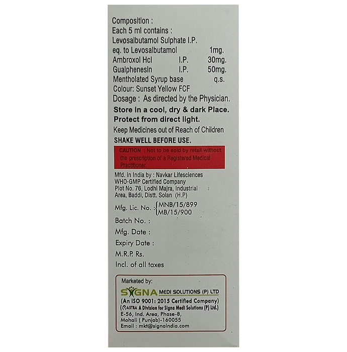 Marketer:Signa Medisolutions Pvt Ltd,Composition:Levosalbutamol (1mg/5ml) + Ambroxol (30mg/5ml) + Guaifenesin (50mg/5ml), medicine_typedrugs,Packaging Detail:bottle of 100 ml Syrup,                   Package:Bottle,Qty:100 ml,Product Form:Syrup, prescription_required:Prescription Required,primary_use: