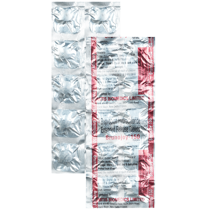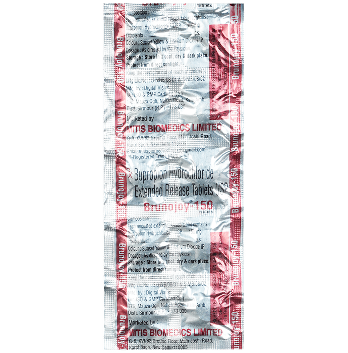 description:Brunojoy 150 Tablet ER is used in the treatment of depression and smoking addiction. This medicine helps by increasing the level of chemical messengers in the brain that relax the nerves and have a calming effect on the brain. Brunojoy 150 Tablet ER may be taken with or without food. It is advised to take this medicine at a fixed time each day. You should never skip any doses and finish the full course of treatment even if you feel better. This medication mustn’t be stopped suddenly as it may worsen your symptoms.Some common side effects of this medicine include insomnia (difficulty sleeping), allergic reaction, impaired concentration, sweating, headache, nausea, vomiting, and dry mouth. It even causes dizziness and sleepiness, so do not drive or do anything that requires mental focus. Moreover, most of the side effects are immediate and often go away with time. Please consult your doctor if these bother you or do not go away.Before taking this medicine it is important to inform your doctor if you have any history of seizure or if you drink alcohol. Inform your doctor if you develop any unusual mood changes or if you have any suicidal thoughts.