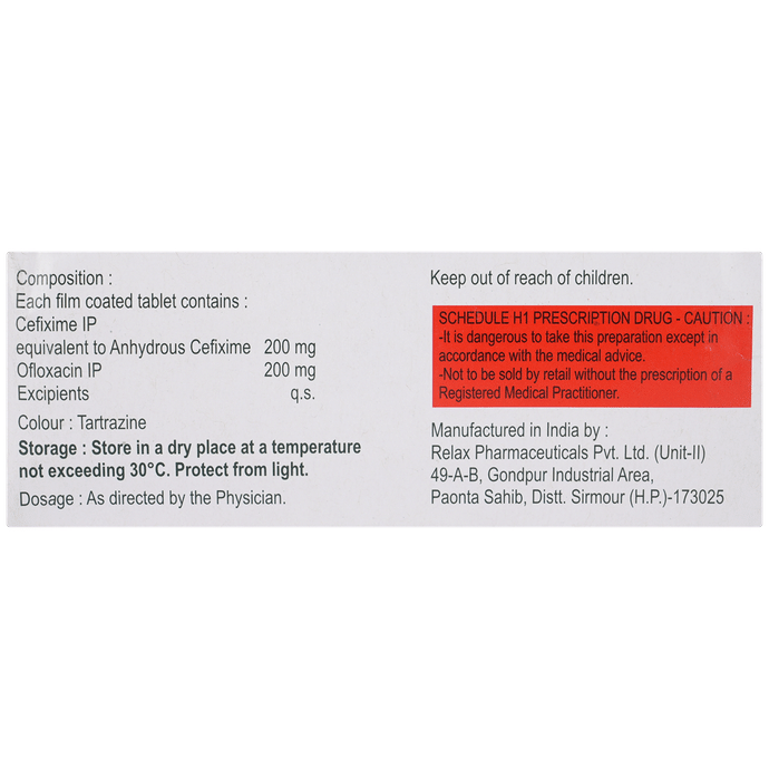 Marketer:Mankind Pharma Ltd,Composition:Cefixime (200mg) + Ofloxacin (200mg), medicine_typedrugs,Packaging Detail:strip of 10 tablets,          Package:Strip,Qty:10,Product Form:Tablet, prescription_required:Prescription Required,primary_use: