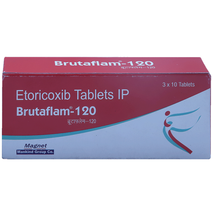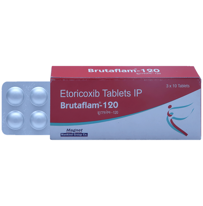 description:Brutaflam 120mg Tablet is a pain-relieving medicine. It is used for relieving moderate pain and swelling of joints associated with different forms of gout and arthritis. It effectively alleviates pain, redness, and swelling. Brutaflam 120mg Tablet should be taken in the dose and duration as advised by your doctor. Brutaflam 120mg Tablet may be taken with or without food. Do not take more than prescribed dose.Flu-like symptoms, indigestion, stomach pain, diarrhea, indigestion, edema, headache, palpitations, and hypertension are some of the side effects that might be seen with this medicine. It may also cause dizziness and fatigue. You should not drive or do anything requiring concentration until you know how it affects you.Brutaflam 120mg Tablet is potentially unsafe to take it during pregnancy. Inform your doctor if you have a history of stomach ulcers, heart diseases, high blood pressure, and liver or kidney disease.