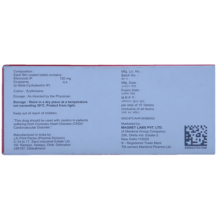 Marketer:Mankind Pharma Ltd,Composition:Etoricoxib (120mg), medicine_typedrugs,Packaging Detail:strip of 10 tablets,          Package:Strip,Qty:10,Product Form:Tablet, prescription_required:Prescription Required,primary_use:
