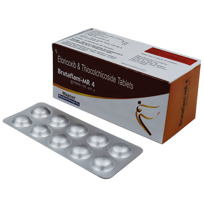 description:Brutaflam-MR 4 Tablet is a combination of two medicines used in the treatment of pain due to muscle spasms. It improves the movement of muscles and provides relief from pain and discomfort associated with muscle spasms. Brutaflam-MR 4 Tablet may be taken with or without food. Take it in the dose and duration as precribed by the doctor. Do not take more or use it for a longer duration than recommended by your doctor.Common side effects of this medicine include abdominal pain, constipation, diarrhea, nausea, vomiting, dizziness, and drowsiness. If any of these side effects persit or bother you, you should let your doctor know. Your doctor may help with ways to reduce or prevent these side effects.The medicine may not be suitable for everybody. Before taking it, let your doctor know if you have any problems with your heart, kidneys, and liver. To make sure it is safe for you, let your doctor also know all the other medicines you are taking. Pregnant and breastfeeding mothers should first consult their doctors before using the medicine.
