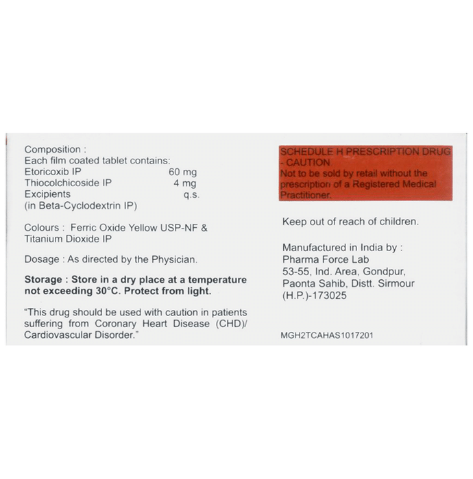 Marketer:Mankind Pharma Ltd,Composition:Etoricoxib (60mg) + Thiocolchicoside (4mg), medicine_typedrugs,Packaging Detail:strip of 10 tablets,          Package:Strip,Qty:10,Product Form:Tablet, prescription_required:Prescription Required,primary_use: