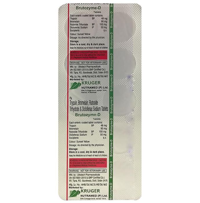 Marketer:Kruger Nutra Med Pvt Ltd,Composition:Trypsin (48mg) + Bromelain (90mg) + Rutoside (100mg) + Diclofenac (50mg), medicine_typedrugs,Packaging Detail:strip of 10 tablets,          Package:Strip,Qty:10,Product Form:Tablet, prescription_required:Prescription Required,primary_use: