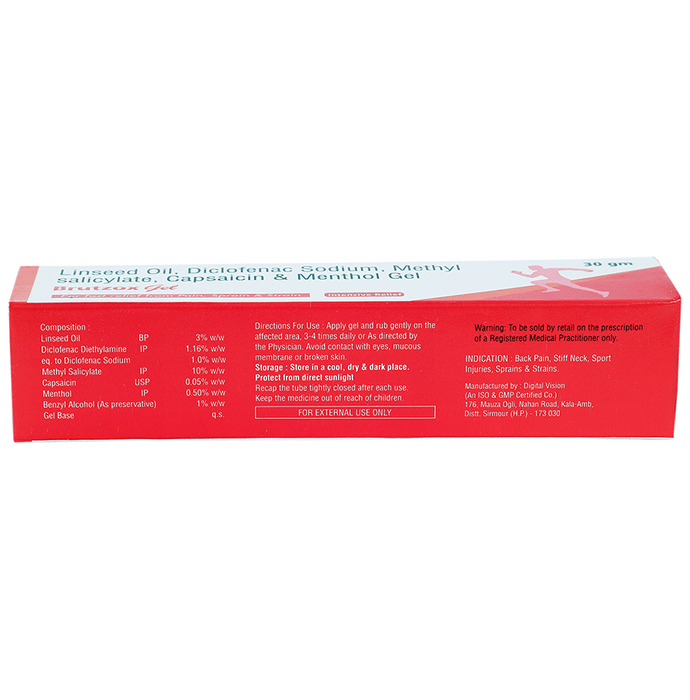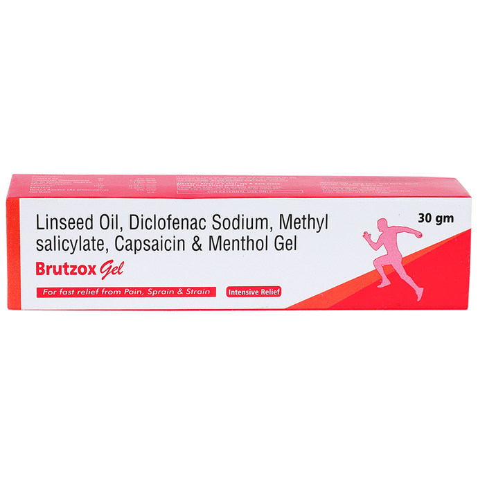 description:Brutzox Gel is a combination medicine that helps in relieving pain. It works by first cooling the skin then warming it up. This cooling and warming up action improves blood circulation and distracts the patient from pain. Brutzox Gel is only meant for external use and should be used strictly as advised by your doctor. Rub a thin layer of the medicine into the affected areas with clean and dry hands. Avoid getting in contact with your eyes, nose, or mouth and avoid applying it on wounded or damaged skin. In case of accidental contact with these areas, you should rinse it with plenty of cold water.Using this medicine may cause common side effects such as burning or stinging sensation, irritation, itching, and redness at the site of application in some people. Usually, the side effects will slowly go away as your body gets used to it. If they get worse or do not go away, you should let your doctor know.Although medicines used on the skin are not normally affected by other medicines you should let your doctor know if you are taking any other medicine to be safe. You should also let your doctor know if you have any medical conditions or disorders to make sure it is safe. Ask your doctor for advice if you are pregnant or breastfeeding.